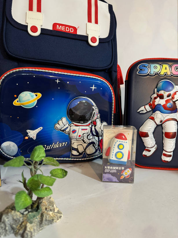 ست مدرسه وارداتی فضانورد شامل کیف و بطری و جامدادی و غلط گیر و چسب ماتیکی