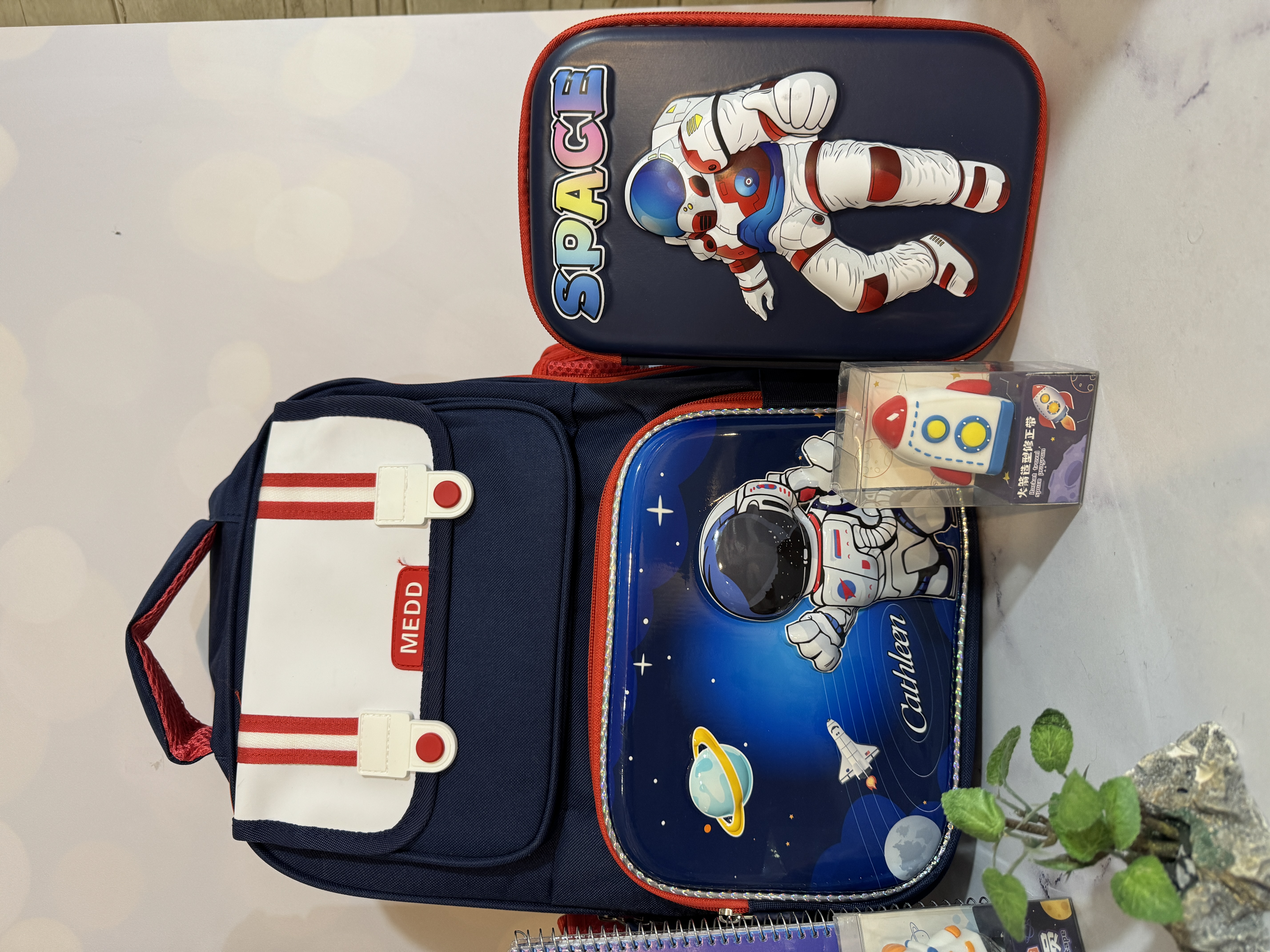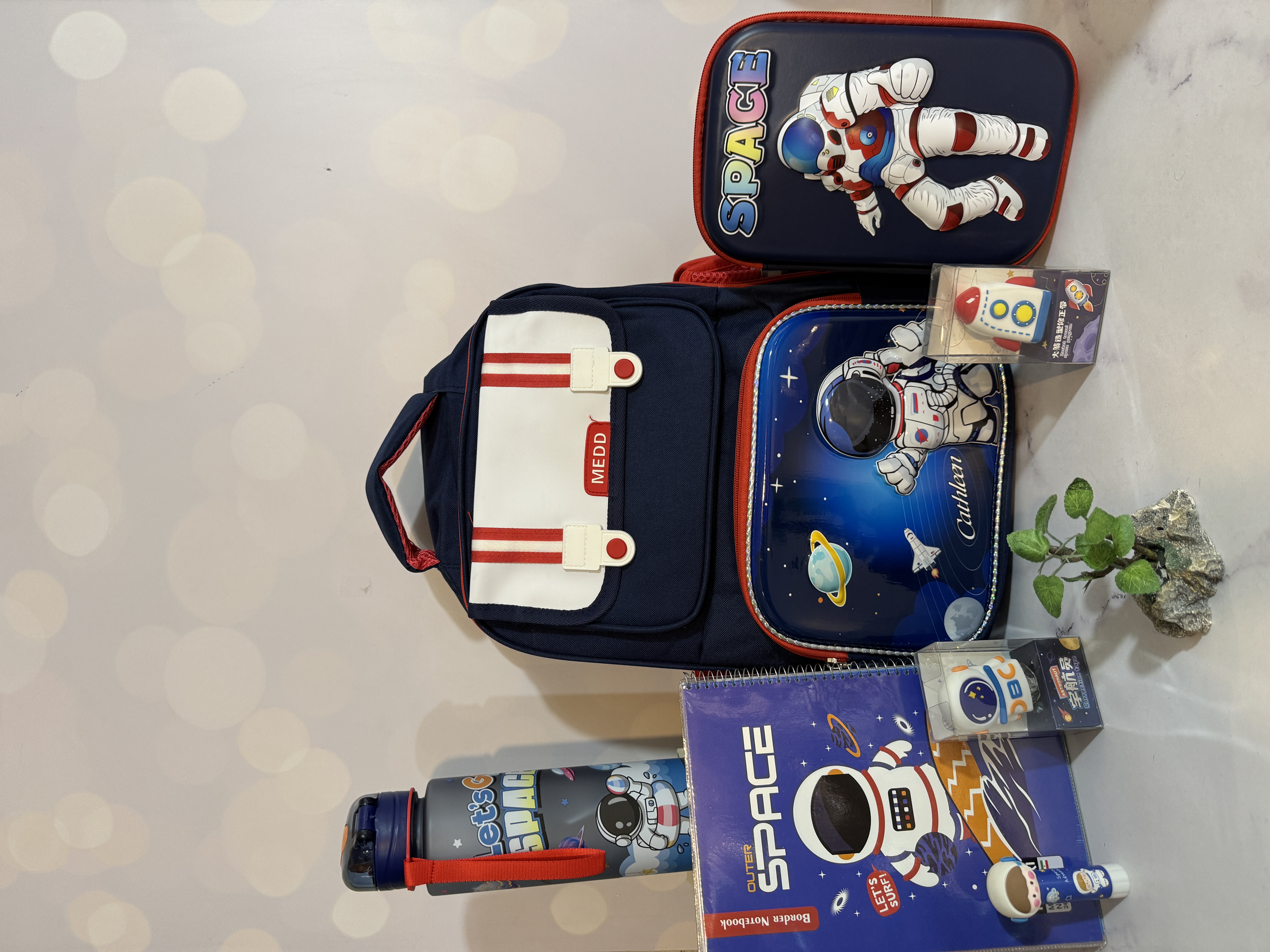 ست مدرسه وارداتی فضانورد شامل کیف و بطری و جامدادی و غلط گیر و چسب ماتیکی
